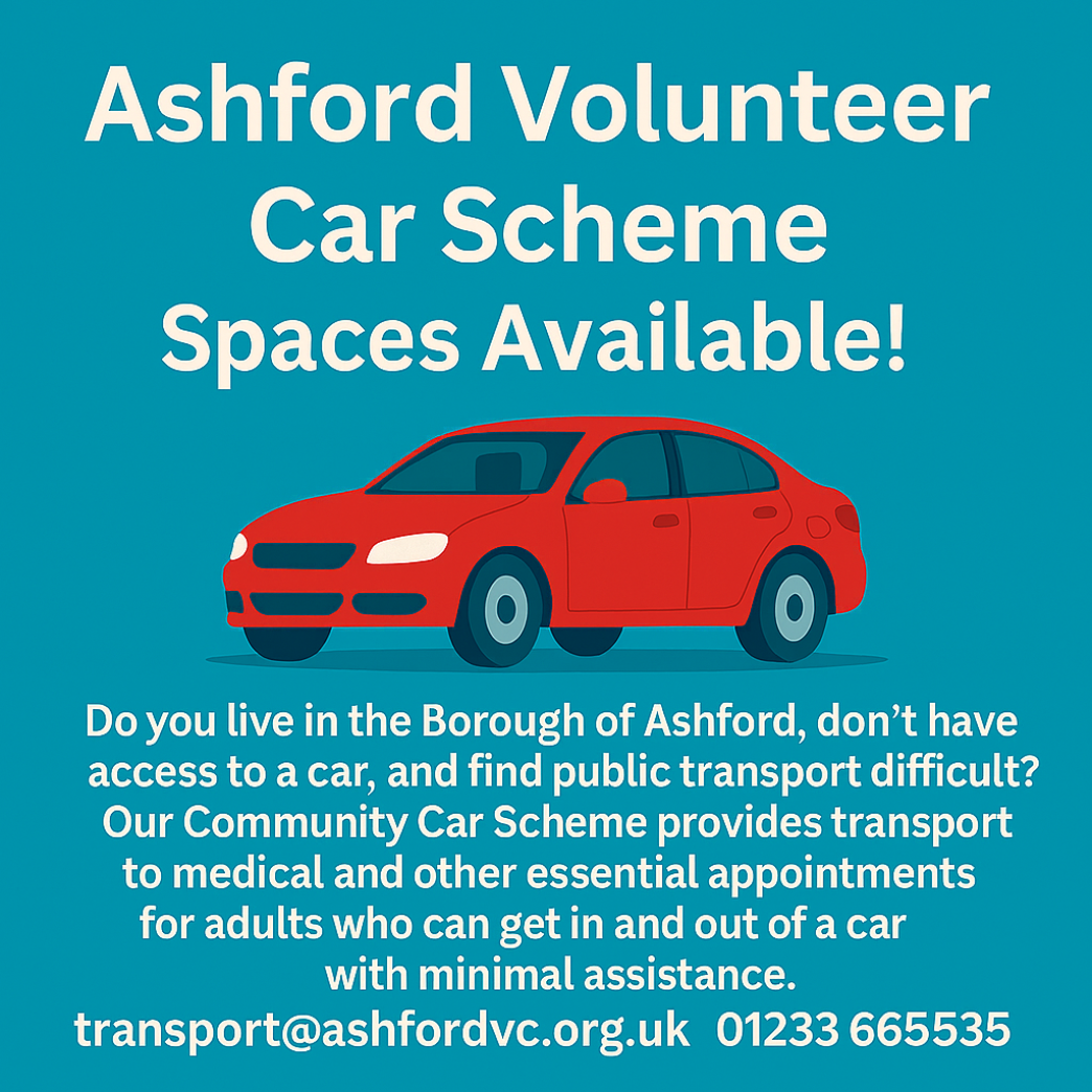 To register or book, please email transport@ashfordvc.org.uk or call 01233 665535. Please book as early as possible so we can find a suitable driver.